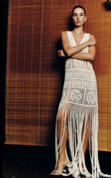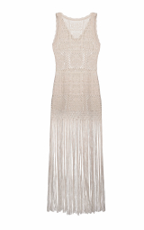 Details: scalloped V-neck and armholes, long fringe at hem