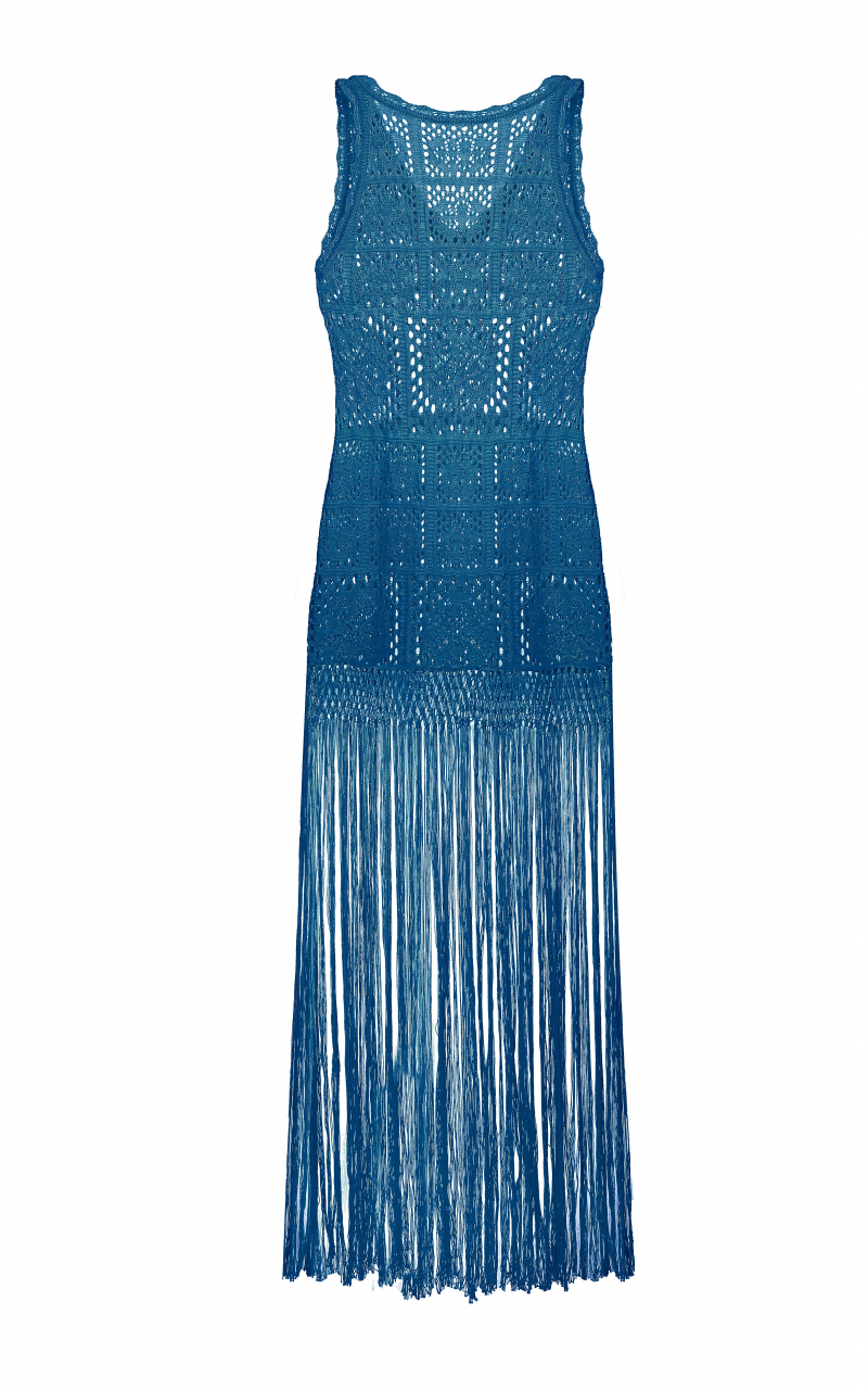 Details: scalloped V-neck and armholes, long fringe at hem