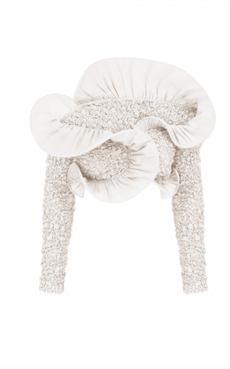Модель: Укорочена блуза в стилі болеро з відкритими плечима та довгими рукавами, з круговою структурованою оборкою