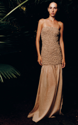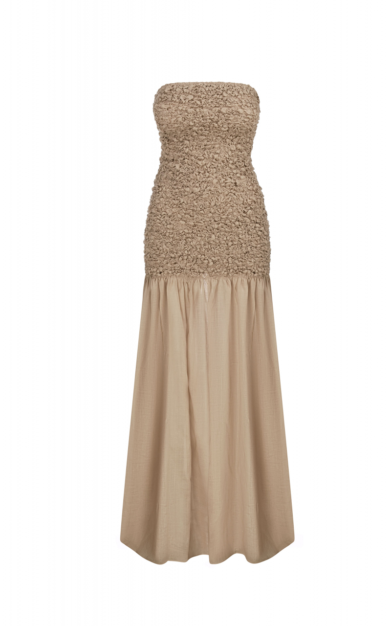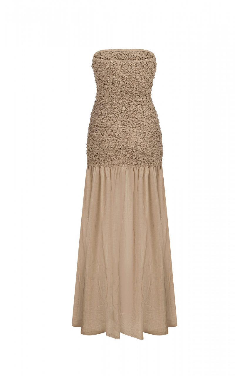 Модель: Довга сукня в підлогу без бретелей з прямим ліфом і гладкою зібраною спідницею