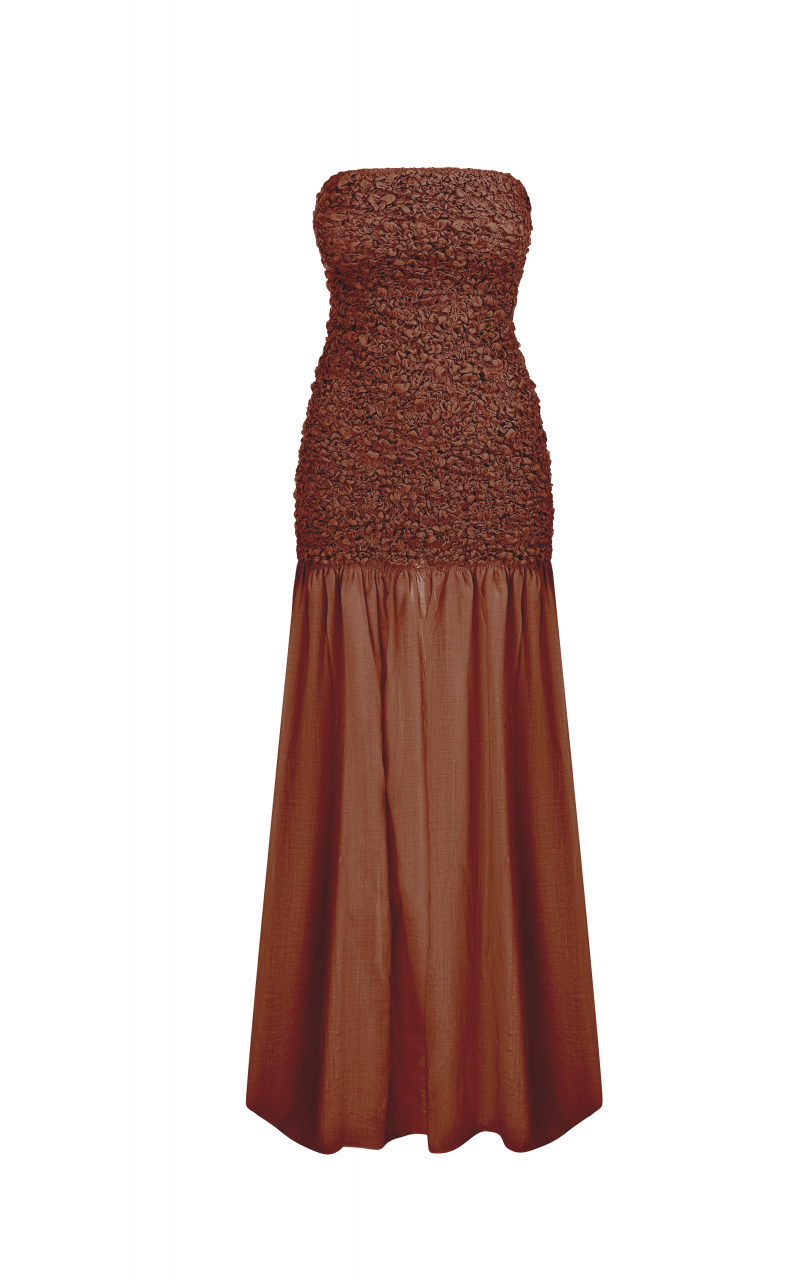 Модель: Довга сукня в підлогу без бретелей з прямим ліфом і гладкою зібраною спідницею