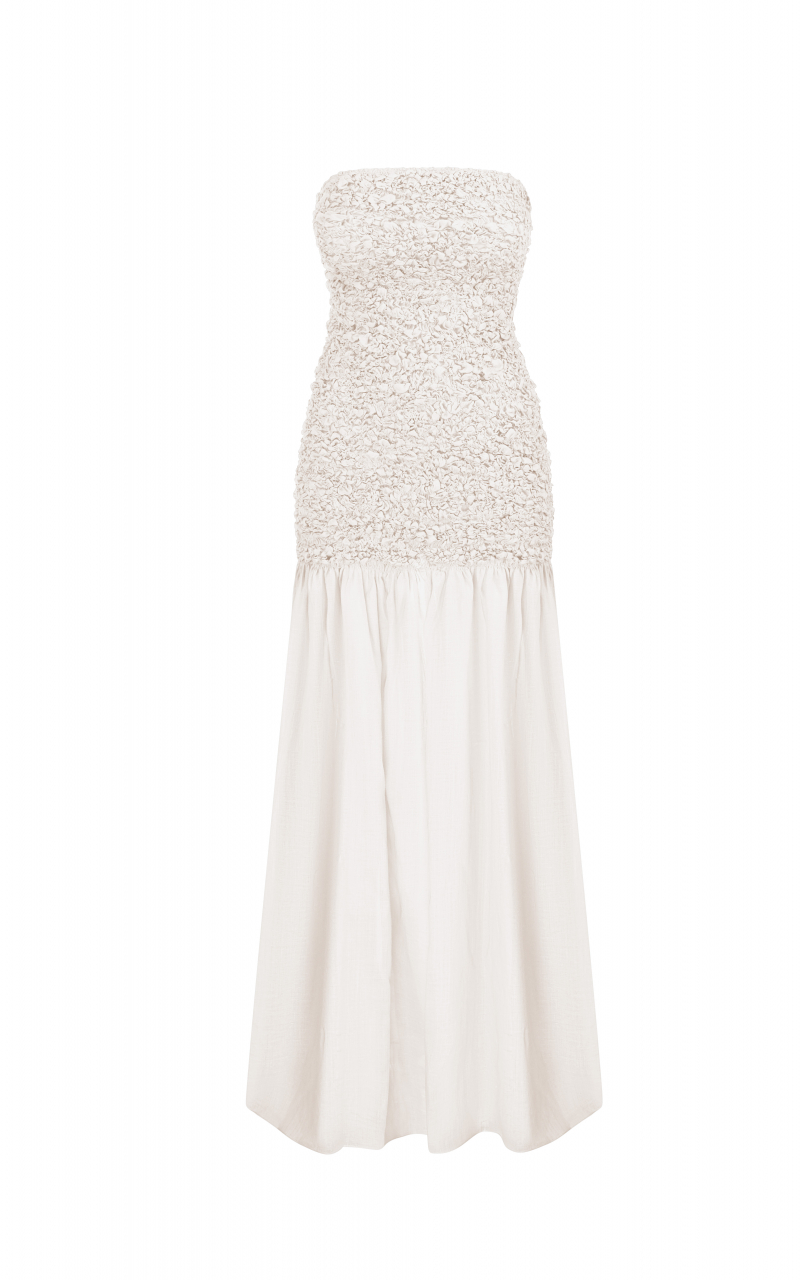 Модель: Довга сукня в підлогу без бретелей з прямим ліфом і гладкою зібраною спідницею
