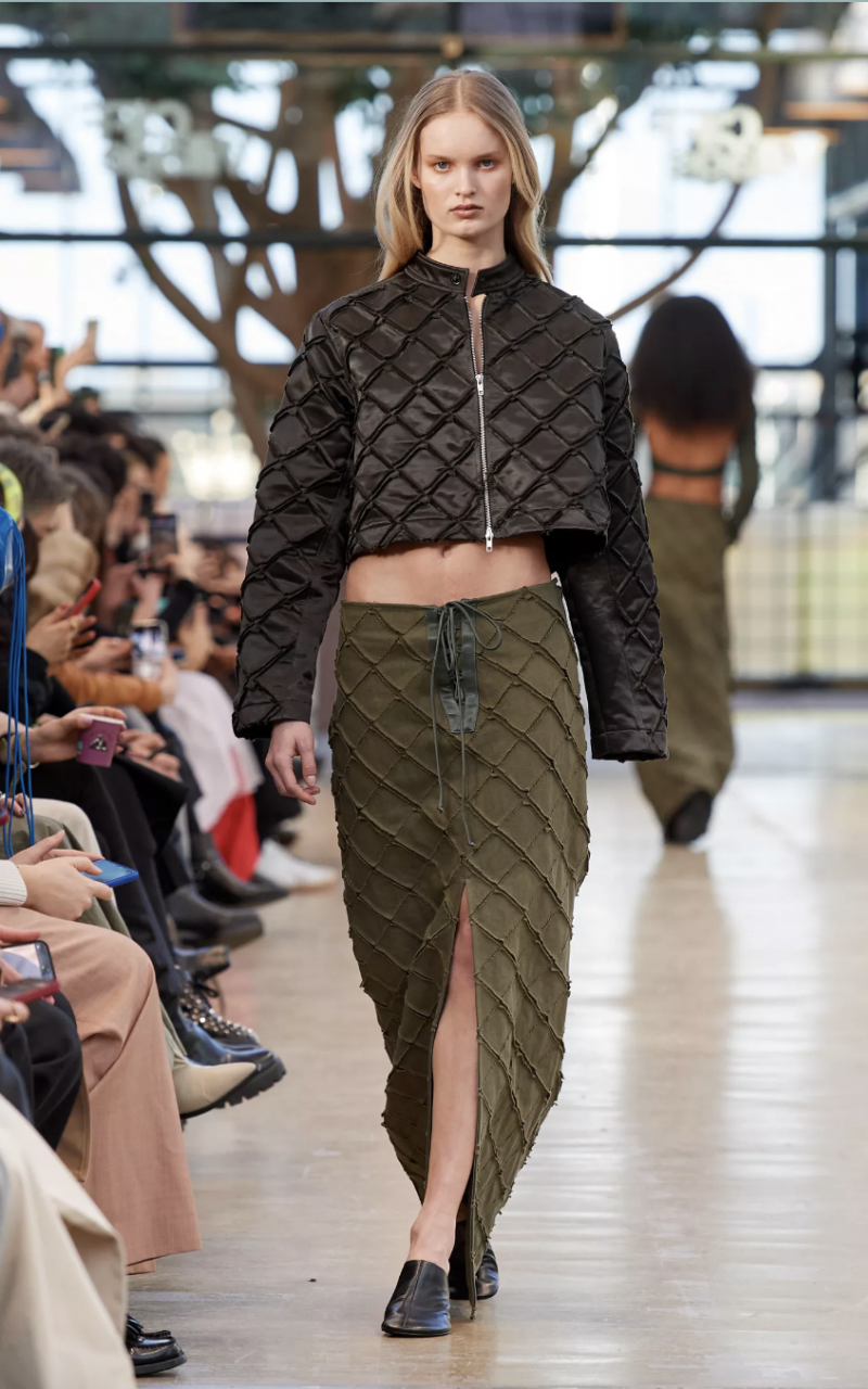 Деталі: декоративна шнурівка та високий розріз спереду, двошарова тканина з потертим ромбовим малюнком
